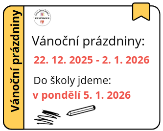Vánoční prázdniny jsou od 23. 12. 2024 do 03. 01. 2025. Ve škole se uvidíme 06. 01. 2025.