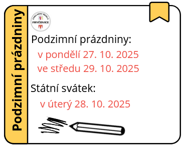 V pátek 10. 10. 2025 bude provoz školní družiny z organizačních důvodů pouze do 15:00 hod. Více