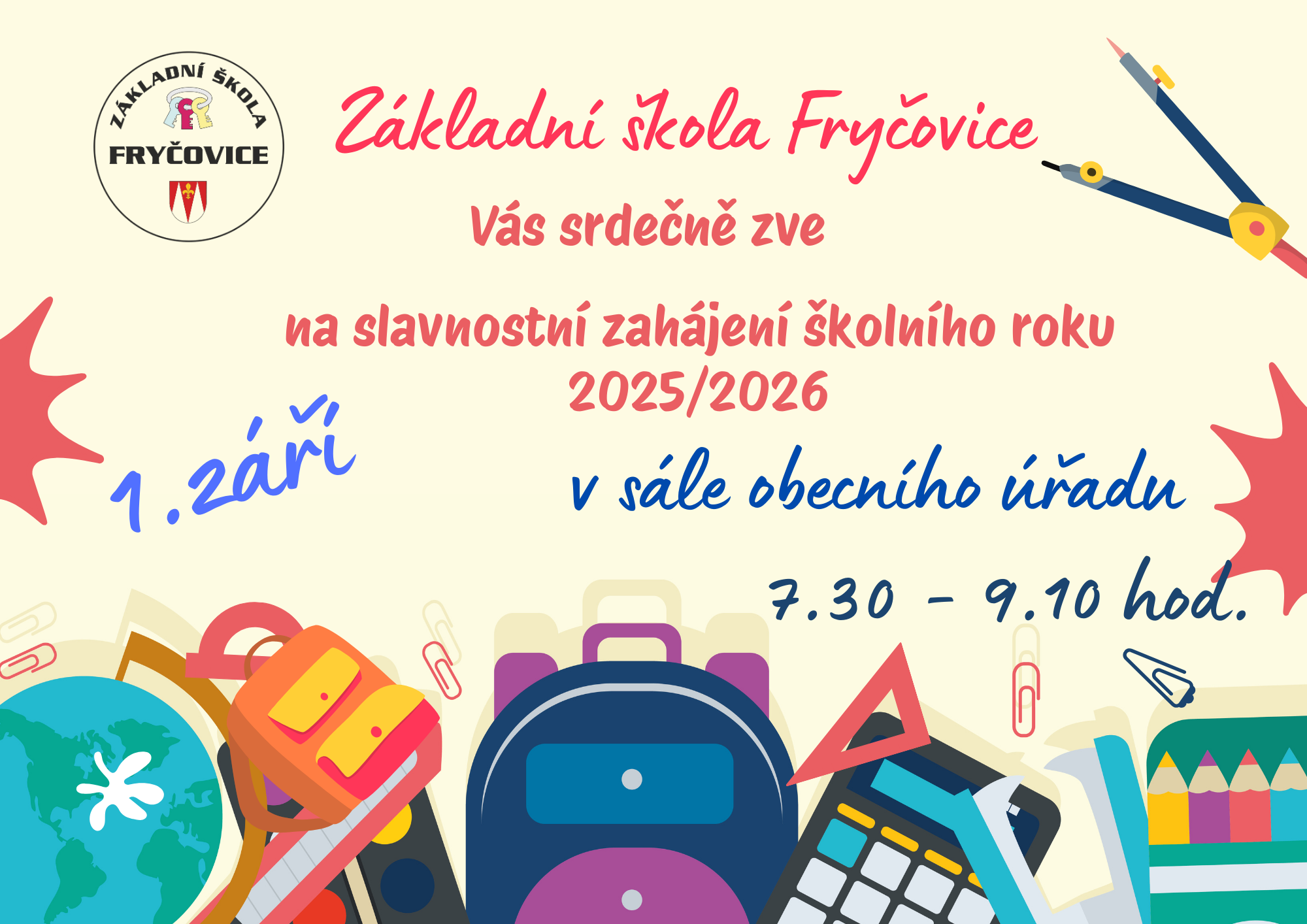 Slavnostní zahájení nového školního roku proběhne 2. září v 8:00 hod. ve školní jídelně. Výuka bude ukončena v 9:10 hod. Těšíme se na Vás!